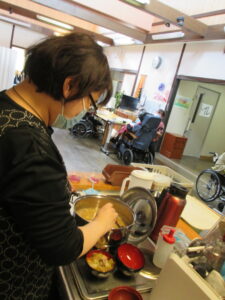 おにぎりを握ったり、芋煮の材料を切ったり、本来なら入居者さまにお願いできることも、今回は全て職員が行いました。 それでもユニットには、いつもはしない包丁で食材を切る“トントン”という耳なじみの音が響き、味噌の香りがいっぱいに広がり、職員も含め、皆さんの食欲は十二分に刺激された様子でした。