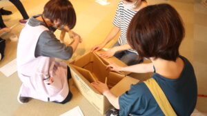 参考動画・資料『段ボールトイレの作り方』を見ながら、グループごとに作業を進めます。
