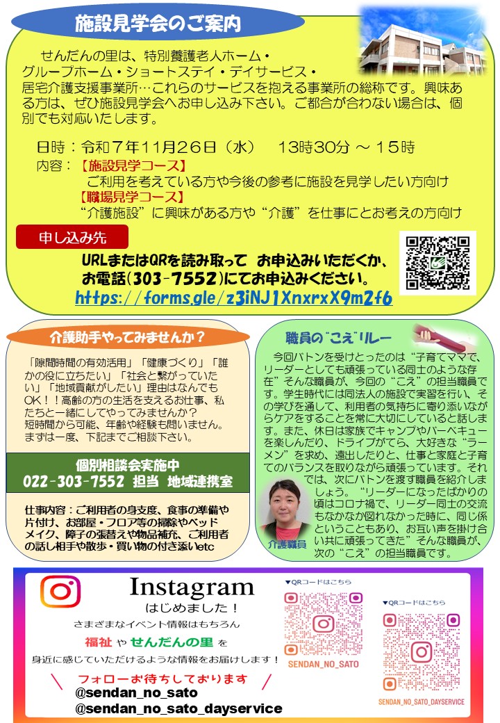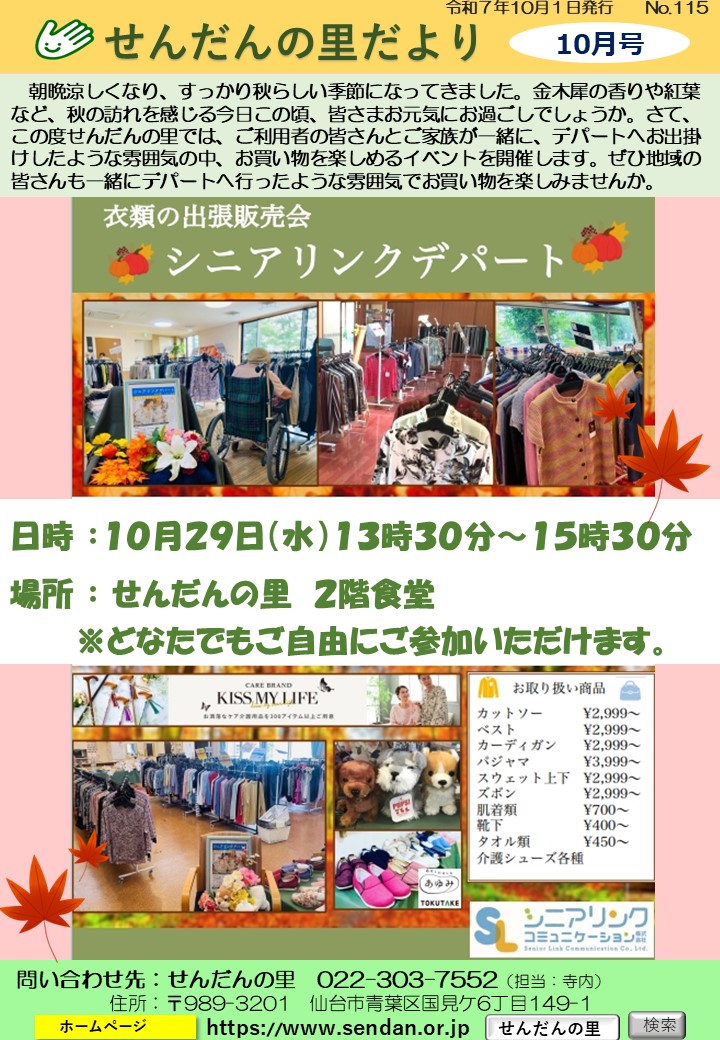 今月号は、表面に10月29日(水)13時30分~15時30分で開催します“シニアリンクデパート(衣類の出張販売会)”のご案内と裏面に11月26日(水)開催の“施設見学会”のご案内や連載『職員の“声”リレー』等を掲載しています。