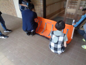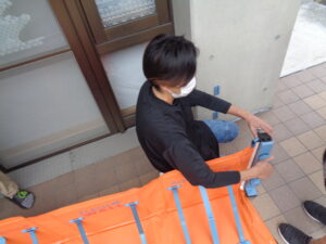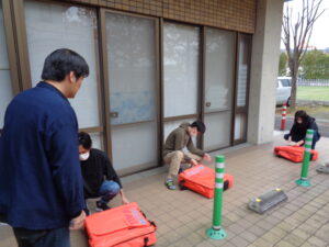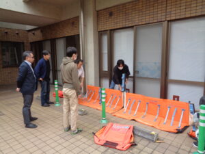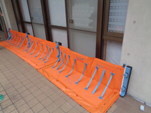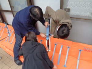 今まで浸水が見られた場所に行き、防水版を設置する訓練を行いました。