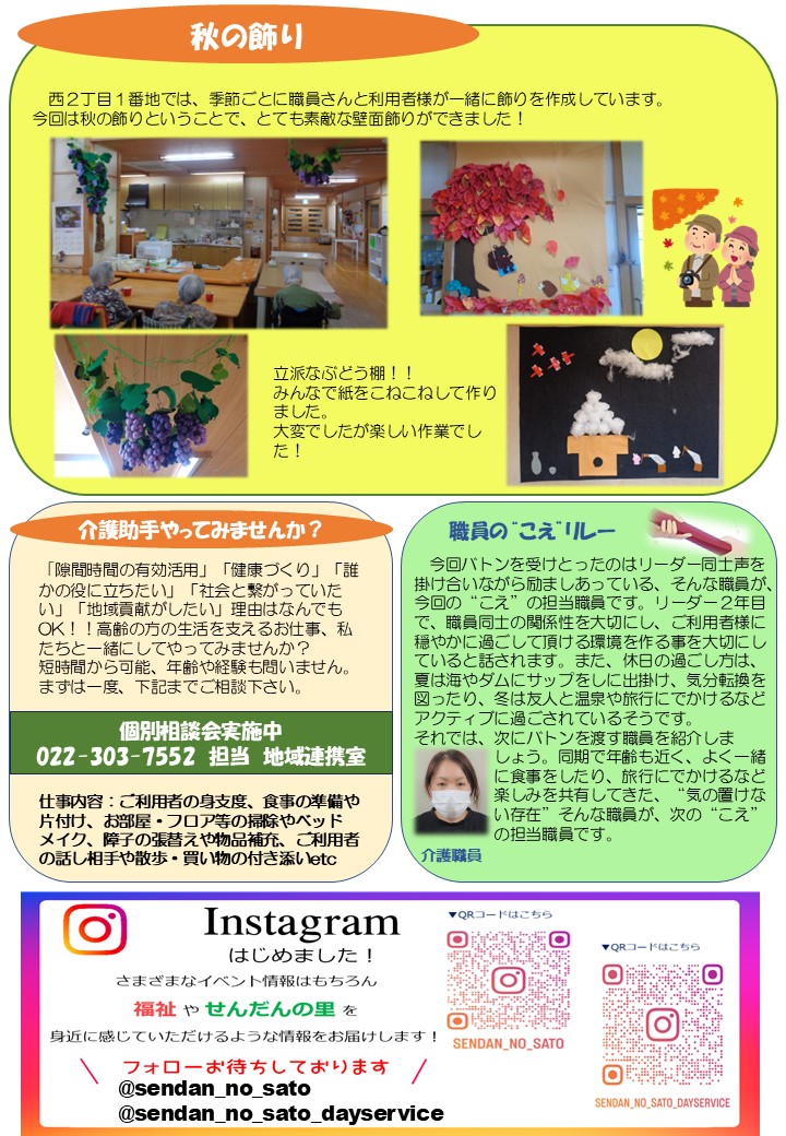 裏面には、特別養護老人ホームにて作成した秋の飾りの様子や職員の“こえ”リレーを掲載しています。
