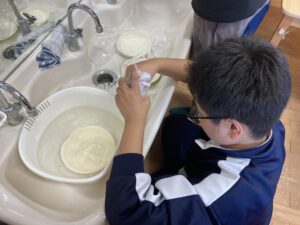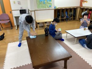 食べ終わったら、お皿洗いとテーブル拭きをします。